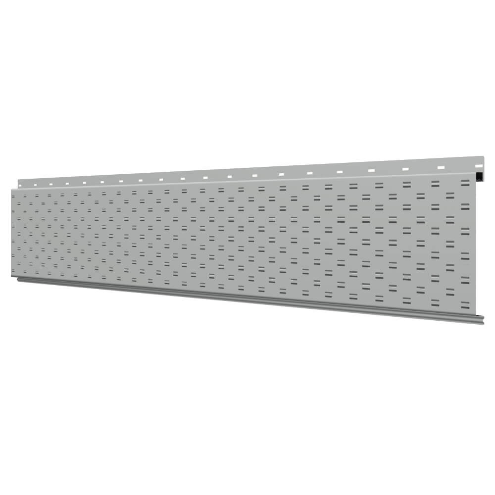 Линеарная потолочно-стеновая панель с ПЕРФОРАЦИЕЙ для вентиляции цвет RAL9006 Серебро применяется в качестве софитов для подшивы крыши, наружной и внутренней отделки потолков, стен, фронтонов фасада дома в Белгороде.