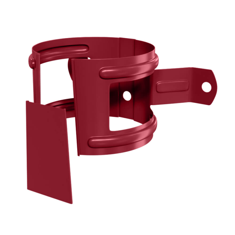 Держатель трубы водостока d100 на дерево RAL 3005 Красное Вино металлический - предназначен для фиксации трубы водосточной на деревянной стене здания. Держатели трубы изготовлены из цельного листа стали толщиной 0.6мм с двусторонним полимерным покрытием Пластизол методом штампования и вырубки, что придает дополнительную прочность и надежность всей конструкции.